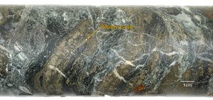 Figure 4. Close-up Photograph of HQ Size Core, showing visible gold in Hole THN25-361 at 112.2m.
